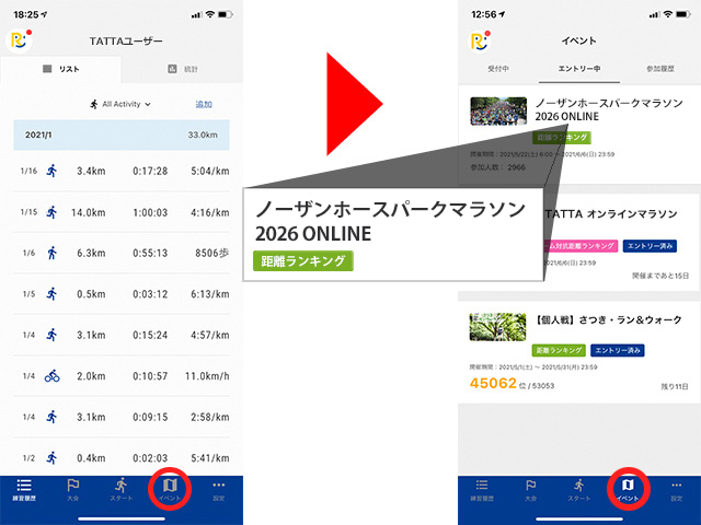 TATTAアプリ内[イベント]をタップし、「ノーザンホースパークマラソン2026 ONLINE」が表示されているか確認してください。表示されていれば準備OK!(エントリー手続後、即日反映されます)