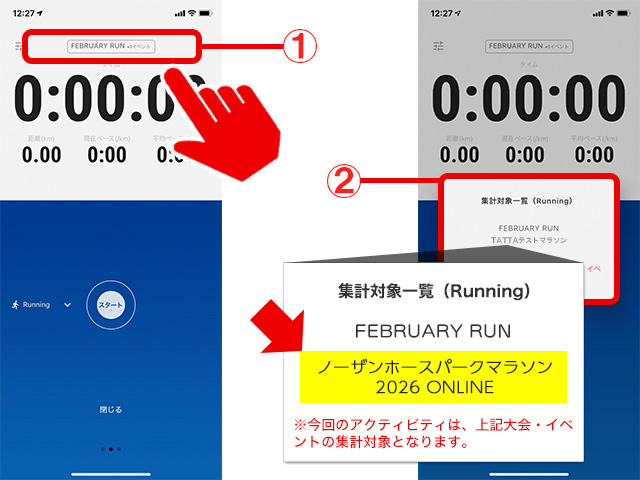 TATTAアプリ内[イベント]をタップし、「ノーザンホースパークマラソン2026 ONLINE」が表示されているか確認してください。表示されていれば準備OK!(エントリー手続後、即日反映されます)